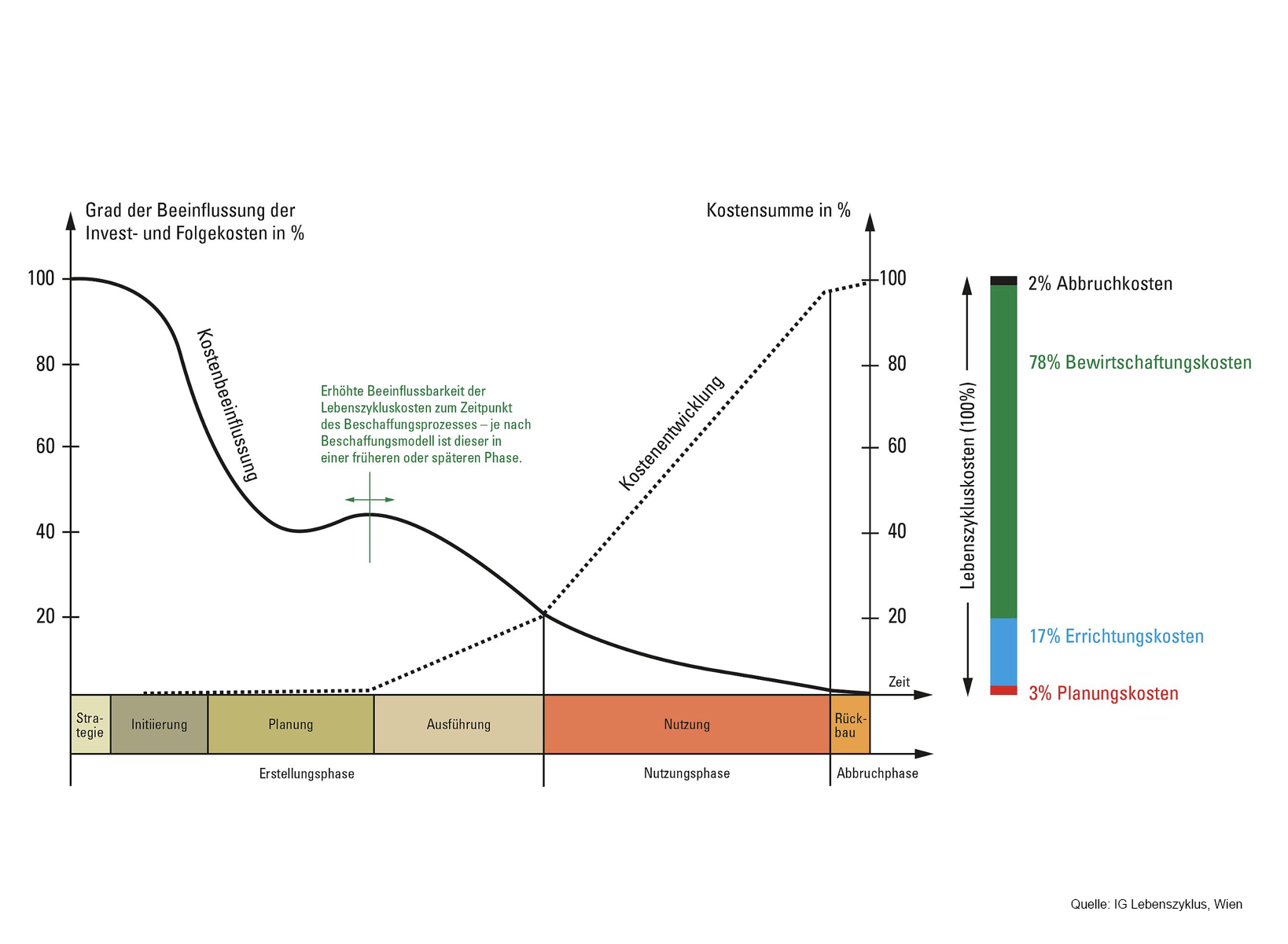 - Die Gesamtkosten werden in der Entwicklung und Planung in hohem Maß bereits festgelegt und können in dieser Phase mit vergleichbar wenig Aufwand wesentlich beeinflusst werden. Gewünschte Qualitäten werden früh bestimmt. Dieser Zugang macht Projekte kontrollier- und sehr früh steuerbar.
